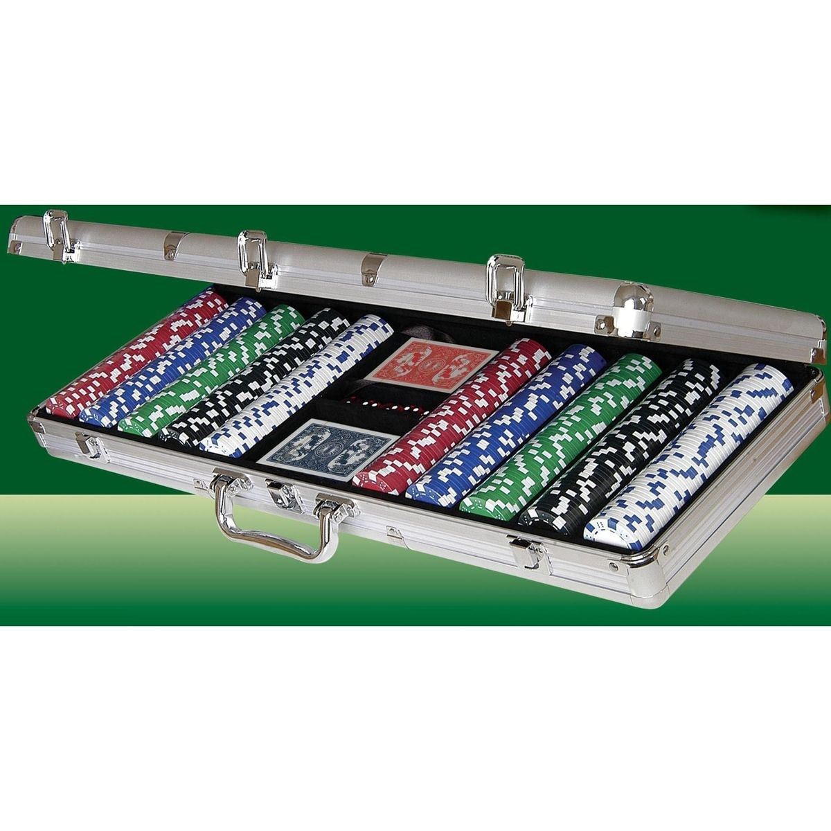 Poker etui iz aluminija. 500 profesionalnih žetonov. Dizajn kock/kart. Dvobarvni žetoni, 11 gramov, 40 mm. Z dvema kompletoma poker kart in 5 kockami. Luksuzni etui z zaobljenimi vogali. Dimenzije 57,5 x 21 x 6 cm. Pakirano v foto kartonu.