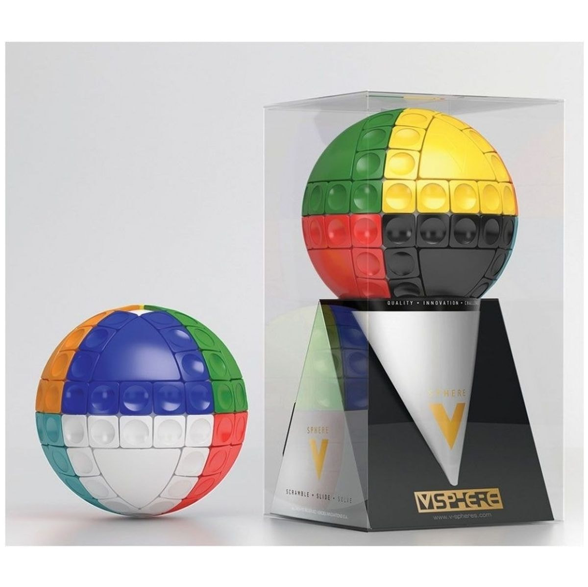 Ja, krogla. Vrhunska in inovativna oblika je sestavljena iz osmih fiksnih barvnih trikotnikov, od teh jih sedem obdaja dvanajst barvnih premičnih kvadratkov, zadnji pa je obdan le z enajstimi, tako da vedno ostane prazen prostor, ki omogoča premikanje in barvno usklajevanje kvadratkov za vrnitev krogle v prvotno stanje.