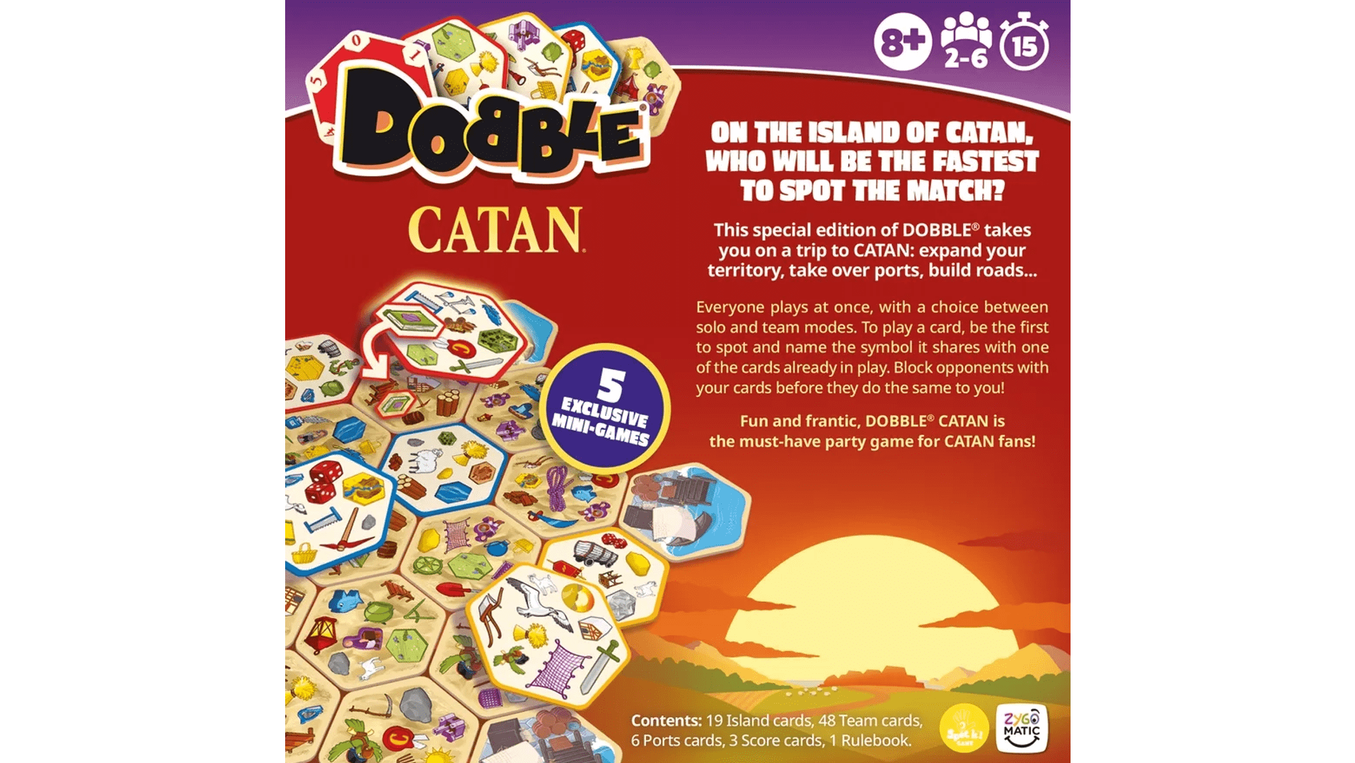 Dobble sreča Catan! DOBBLE CATAN vas popelje na legendarni otok Klausa Teuberja v realtime igri odkrivanja in raziskovanja. Igra združuje preprosto mehaniko iskanja ujemajočih se simbolov s Catanovo tematiko, ponuja pa kar pet različnih mini iger, ki preizkušajo vašo hitrost in natančnost opazovanja.
